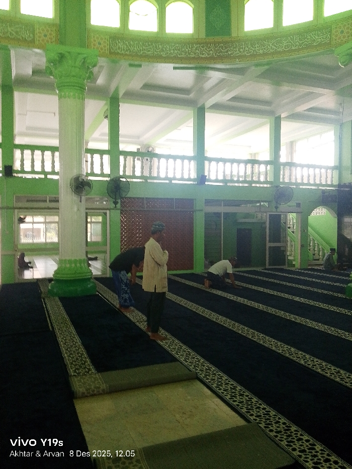 Inside a mosque, dark blue carpets with ornate borders stretch across the floor. Several men are present, some standing, others kneeling in prayer, all facing a direction not visible. One man stands with his arms crossed. A large, green column supports a balcony with a balustrade. Islamic calligraphy adorns the upper walls. Fans are mounted on the walls. Sunlight filters through windows, illuminating the interior. A partially rolled carpet lies in the foreground. A watermark is at the bottom left.