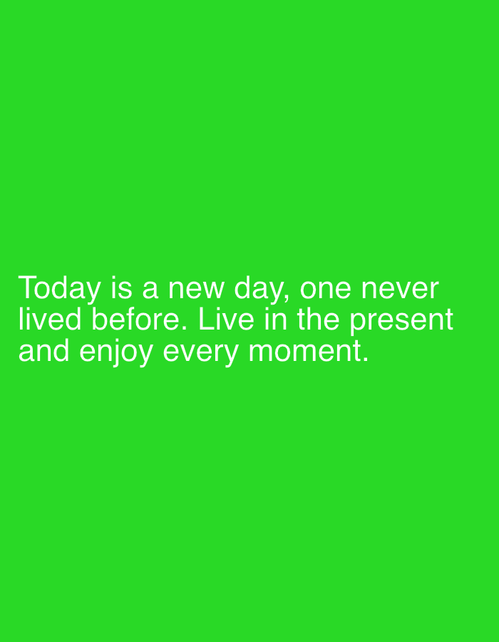 The image displays a solid, vibrant green background. White, sans-serif text is centrally aligned towards the lower half of the frame, stating: "Today is a new day, one never lived before. Live in the present and enjoy every moment." No discernible people, subjects, objects beyond the text, actions, or interactions are depicted. The image does not portray a physical environment or any specific location within the city of Burgas, Bulgaria.