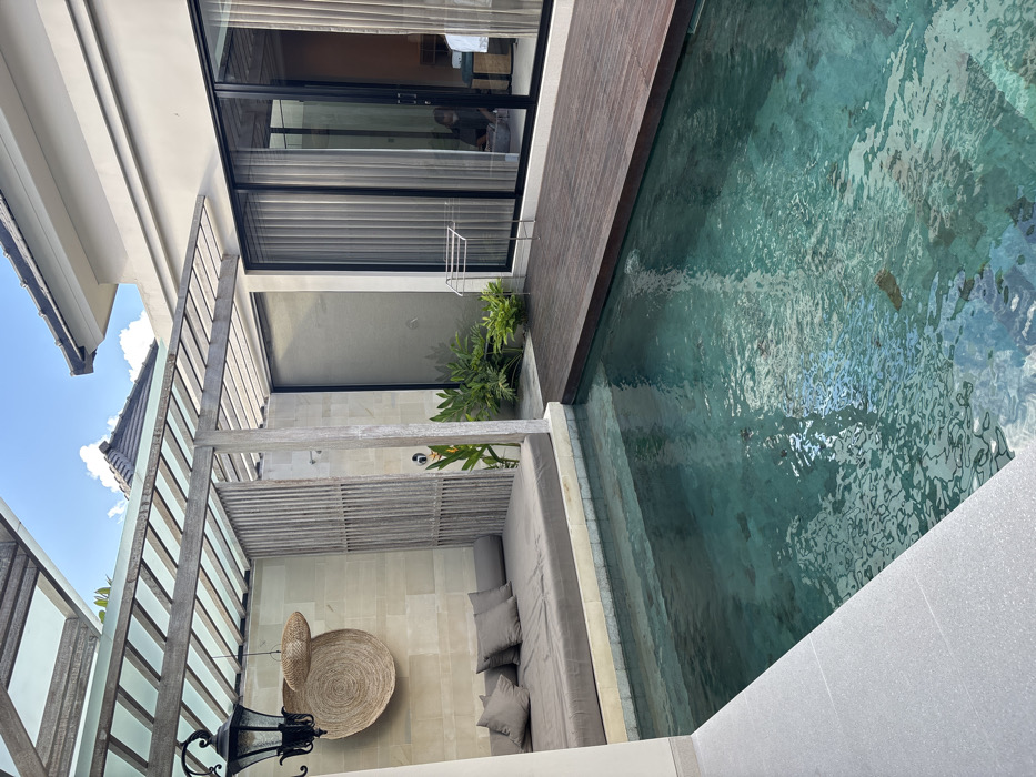 This image depicts an outdoor private area, likely a villa or resort, located in Kerobokan, Indonesia, under clear daylight conditions
