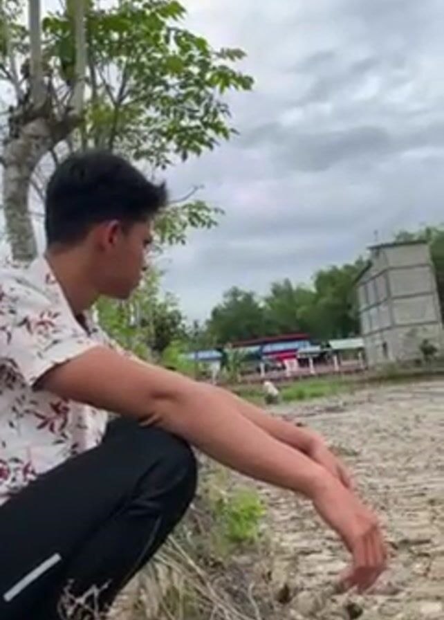 A young man with dark hair, wearing a light-colored patterned shirt and dark pants, squats near the edge of a dry, cracked field, looking towards the middle distance