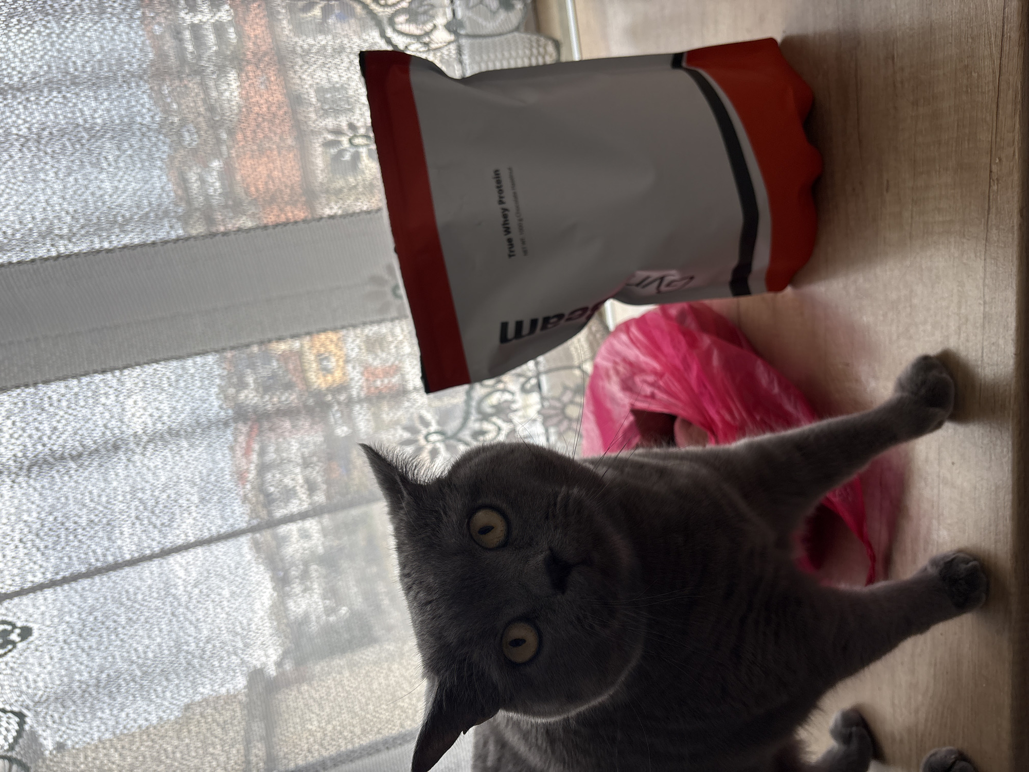 The scene is set indoors in the city of Goce Delcev, Bulgaria, on a light-colored wooden surface, likely a windowsill or table. A short-haired grey cat, with yellow-gold eyes and ears slightly flattened backward, occupies the left-center of the frame, looking directly towards the viewer. To the cat's right stands an upright white, red, and black pouch, labeled "True Whey Protein, NET WT: 1000 g Chocolate Hazelnut," with "VyroTeam" branding partially visible along its left side. A crumpled, translucent pink plastic bag is situated behind the cat and to its left, partially obscured. The background consists of a window covered by a sheer white curtain featuring a decorative pattern. Through the blurred curtain, the outlines of buildings with reddish-brown rooftops and other architectural elements are faintly visible, indicating an urban outdoor environment under daylight conditions. No human presence is observed.