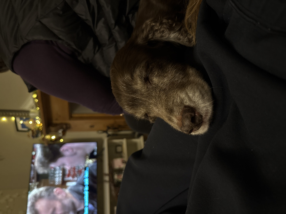 A brown Cocker Spaniel puppy sleeps peacefully. Its head rests on a person’s black shirt. Part of a down jacket is visible behind the dog. A television screen in the background shows a partial image of a man's face. String lights are out of focus above the television. A wooden window frame is visible in the background as well.