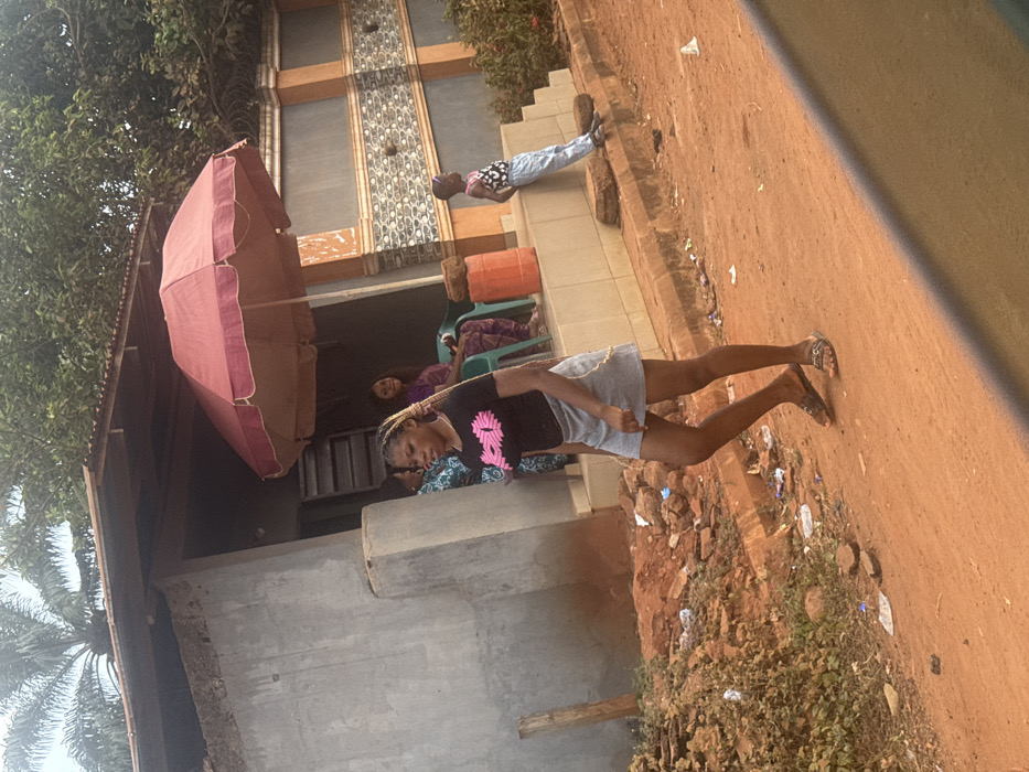 This image depicts an outdoor scene in Enugwu-Ukwu, Nigeria, primarily focusing on a dirt roadside and adjacent structures