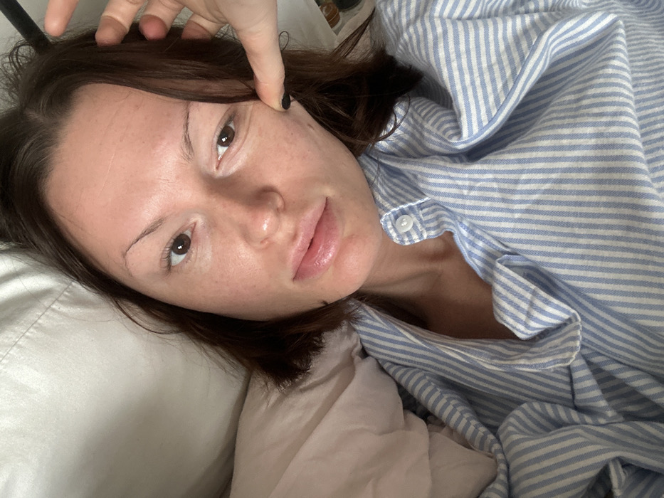 A female individual is depicted in a close-up, high-angle portrait, appearing to be lying down in an indoor setting. She has medium-length, dark brown hair and natural-looking skin, possibly with visible freckles, and appears to be without significant facial makeup. Her brown eyes are open, and she is gazing directly forward. Her lips are full and exhibit a glossy appearance. She is wearing a light blue and white vertically striped button-down shirt, with the top button unfastened. Her left hand, featuring dark-painted fingernails, is raised and lightly touches her left temple/cheek area. The immediate background consists of blurred white and light pink fabric, consistent with bedding or pillows. No specific architectural or environmental features are present to identify a location within the city of Wealden, United Kingdom.