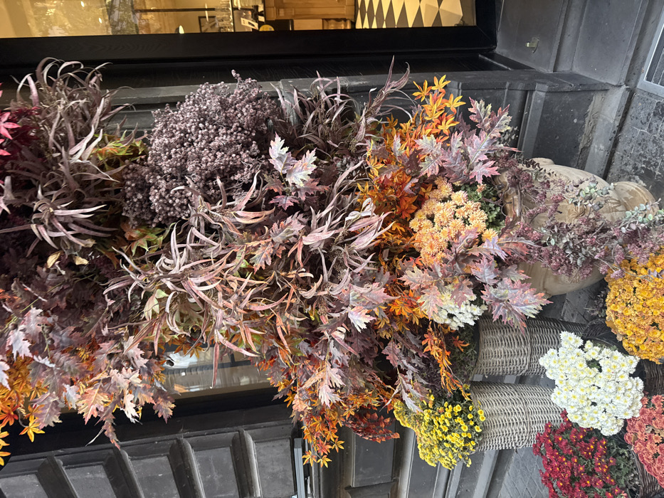 The image depicts an elaborate autumnal floral and foliage display at street level against a building facade in Yerevan, Armenia. The central element is a large, multi-tiered vertical arrangement of artificial plants, primarily featuring broad and narrow leaves in shades of orange, red, brown, purple, and pale green, characteristic of fall foliage. This arrangement emanates from a large, light-colored, ornate terracotta-style planter situated on the pavement at the lower center. Trailing green and purple foliage extends downwards from this main planter. Within the upper sections of the display, clusters of small, dense, dried-appearing purple flora are integrated, while lower sections include groups of white and orange chrysanthemum-like blooms. On the ground directly in front and to the left of the main planter, several smaller, woven baskets and pots contain live chrysanthemum plants. These include two tall, narrow woven baskets holding vibrant yellow flowers, alongside shorter baskets and pots displaying red, white, and orange chrysanthemums. The building's exterior on the left features a dark grey facade with a repeating pattern of recessed rectangular panels. To the right, a dark-framed glass door or large window reveals a partial interior view. Visible inside are a light-colored counter, various items resembling glassware, and a distinctive black and white checkered floor pattern. No individuals are present in the scene. Illumination appears to be natural daylight.