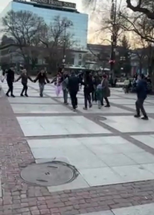 In a wide shot, a group of about 15 people dance in a circle in a public square, holding hands. A person in the center plays a drum. The square is paved with large square tiles. The sky is overcast. In the background is a large modern building labeled "Grand Hotel Sofia." There are bare trees and lamp posts scattered around the square. Some people stand around watching the dancers. The cameraman is stationary.