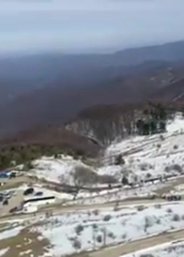panoramic view of a mountainous landscape with patches of snow and a road winding through it. Many people are gathered near a clearing at the base of the mountain, near a parking lot with cars and buses. The camera slowly pans across the landscape, revealing more of the mountain range. The sky is blue with scattered clouds.