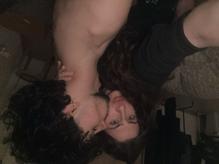 The image depicts two individuals in a dimly lit indoor setting, consistent with a residential room in Sofia, Bulgaria, though no specific city landmarks are visible to confirm the exact location. A female subject, with long dark hair, is positioned in the foreground on the left, looking directly at the camera with her lips puckered. Her left arm is extended, indicating she is likely holding the camera. Her right hand is visible on the neck of the male subject. The male subject, with dark, curly hair, is positioned to the right of the female, kissing her on the right side of her neck or lower cheek. He appears shirtless. The interaction between the two individuals is a close, physical embrace. In the background to the left, a clothes rack with dark garments hanging on it is partially visible. A patterned textile, possibly a blanket or sofa cushion, is present in the lower-left foreground. A dark, indistinct object, possibly a chair, is partially visible in the dim background on the right.