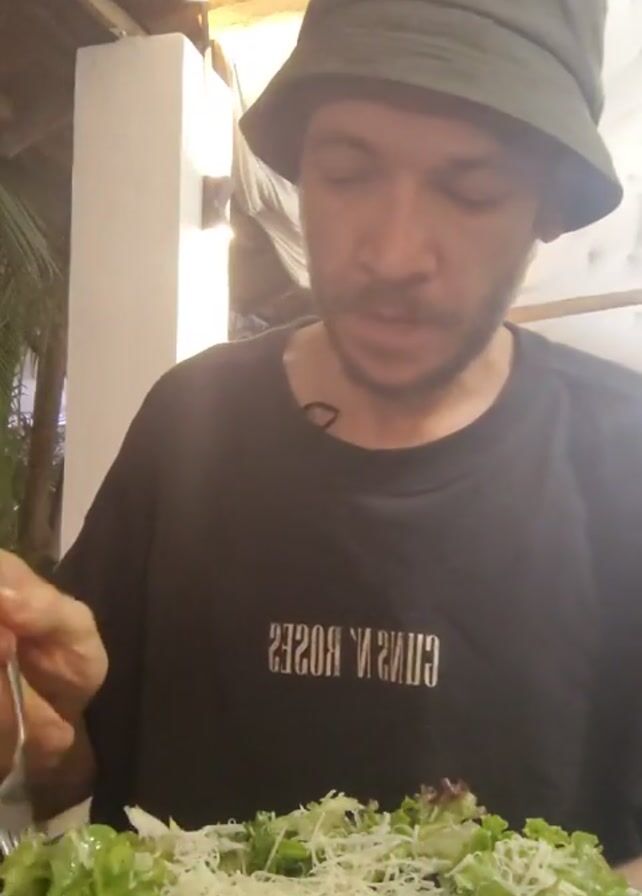 A man is seen eating a salad with a fork. He is wearing a black T-shirt with a Guns N' Roses logo and a green bucket hat. The salad is made of lettuce and topped with shredded cheese. He is sitting in what appears to be an outdoor restaurant setting.