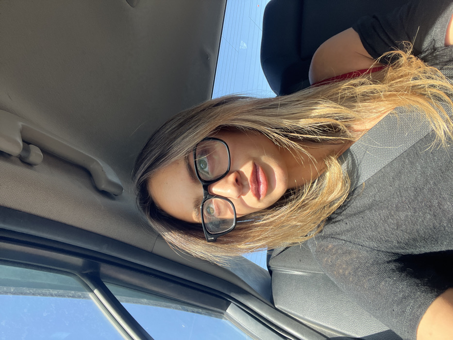 The image depicts a female individual seated in the front passenger seat of a vehicle in Raanana, Israel. She is wearing black-rimmed glasses, a black off-the-shoulder top, and a red strap is visible beneath her top on her right shoulder. Her long, light brown hair with blonde highlights frames her face and shoulders. A seatbelt is fastened across her chest and right shoulder. The subject is looking upwards and towards the viewer's left, with light reflections present in her glasses. The vehicle's interior features black seating upholstery, a grey headliner, and a beige overhead grab handle. A clear blue sky is visible through the side and rear windows, indicating daylight conditions. No specific landmarks or distinguishing features within Raanana are discernible from the exterior views.
