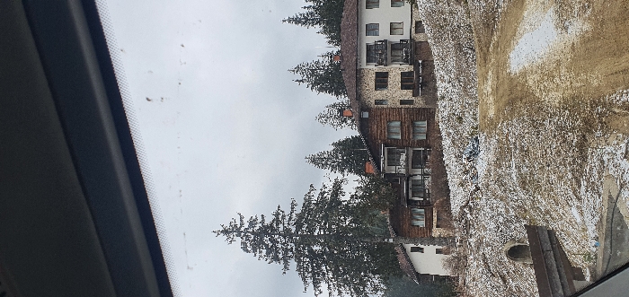 The image, captured from within a vehicle looking through its windshield, depicts a winter landscape in Stoikite, Bulgaria, under an overcast sky. The upper portion of the frame shows the dark grey interior visor and dashboard of the vehicle, with the windshield's top edge visible. The sky is a uniform, light grey, indicating heavy cloud cover. The central and background elements consist of a complex of multi-story buildings situated on a snow-dusted hillside, surrounded by numerous tall, dark green coniferous trees. A particularly prominent conifer stands tall on the left side of the frame. The buildings exhibit varied architectural styles: a section on the far left with a white facade, a central section constructed with dark brown log or timber, featuring multiple balconies with dark railings and numerous windows, and a rightmost section with a stone-clad lower level transitioning to a lighter-colored upper facade, also presenting multiple balconies with dark railings. All building sections are topped with brown pitched roofs. The foreground features a dirt slope partially covered with patches of melting snow and exposed brown earth. A dirt track, also intermittently covered with snow and mud, extends diagonally from the lower right corner towards the center of the image. On the lower left, a dark, angled structure, possibly part of a barrier or vehicle, partially obscures a concrete culvert opening visible beneath the snow-covered ground. No individuals, discernible actions, or interactions are visible within the scene.