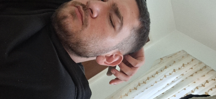 The scene depicts a close-up, angled portrait of an adult male in an indoor setting within Larnaca, Cyprus. The male subject occupies the majority of the left and center frame, presenting a profile view of his right side. He possesses short, dark hair with a faded cut on the sides, and a visible beard and mustache. His eyes are closed. His left hand is positioned behind his right ear, with the fingers extended, appearing to touch or scratch the area. He is wearing a dark, possibly black, hooded garment. The background consists of a plain white ceiling in the upper left, and a window covered by a light-colored curtain with a repetitive scrollwork pattern in the upper right.