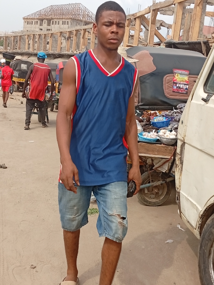 A young man stands in the center of a bustling outdoor market, wearing a blue and red sleeveless basketball jersey and distressed jean shorts. His expression is neutral. Behind him, pedestrians stroll along a sandy path. A parked van and a vendor's cart laden with goods flank him. In the background, an unfinished multi-story building under construction is visible. The scene appears to be a common street view in a developing urban environment.