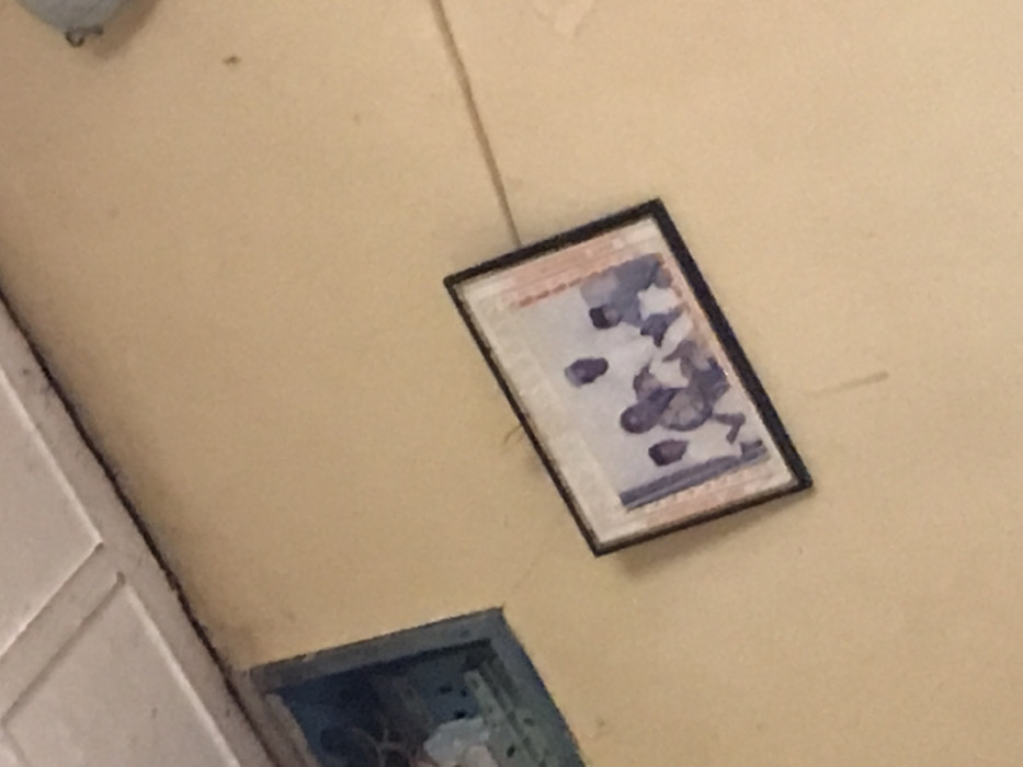 This image captures a framed photograph displayed on a cream-colored interior wall within a location in Lokoja, Nigeria