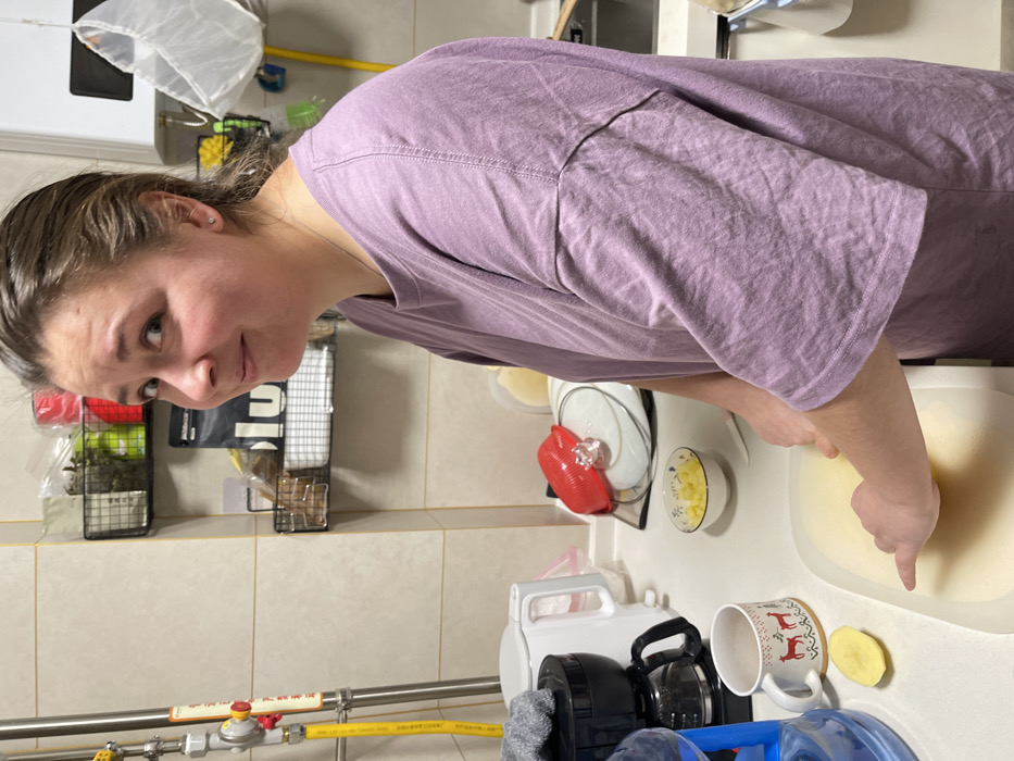 A woman in a lilac t-shirt stands in a kitchen, looking at the camera. She is pointing with her right hand into a large, white bowl. The kitchen has beige tiled walls. Shelves holding containers are visible on the wall. On the counter, there are plates, a bowl of food, a mug with a reindeer pattern, a sliced potato, a coffee maker, a white pitcher, and other items. Yellow gas pipes run along the base of the wall.