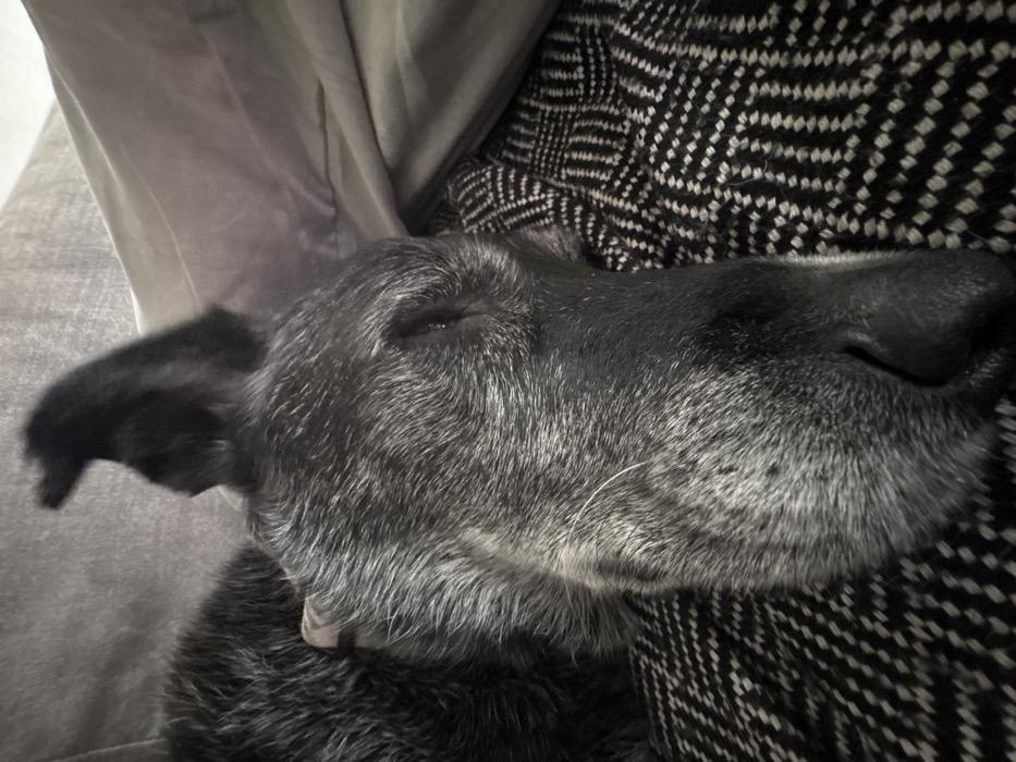 A close-up shot reveals a grey-muzzled dog in repose. Its eyes are closed, and its head rests on a patterned fabric. The dog's fur is a mix of dark and light grey, giving it a distinguished look. A soft grey fabric provides a backdrop. The focus is sharp on the dog's face, highlighting the textures of its fur and the lines of its features.