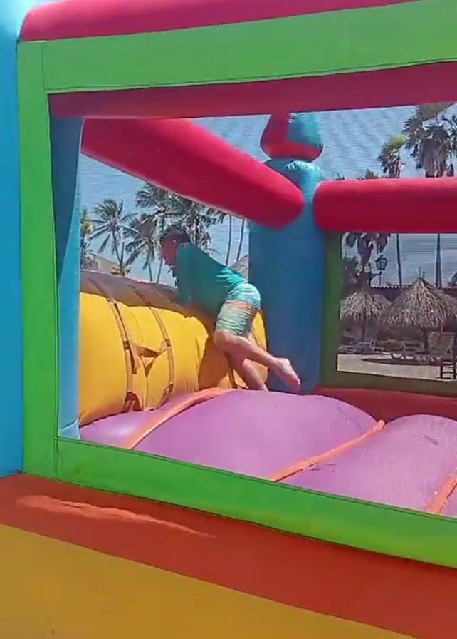 A man runs on an inflatable bounce house structure that leads to a water slide into a pool. He falls off the structure while running, then the view shows the end of the slide and the clear blue pool, surrounded by palm trees, a beach area with thatched umbrellas, and a building in the background. The sky is clear and bright.