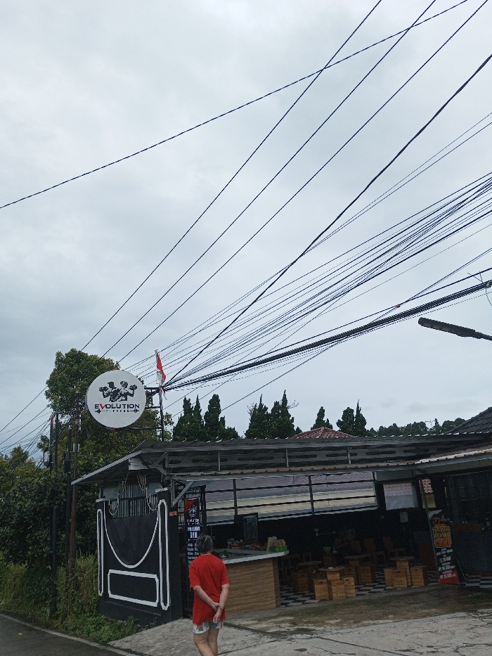 This image depicts an overcast street scene in Ambakirano, Madagascar. The sky is uniformly light grey, with numerous black electrical or utility wires crisscrossing horizontally and diagonally across the upper two-thirds of the frame. A single individual, viewed from behind, is walking away from the camera in the lower center. This person wears a red t-shirt and light-colored shorts, with their hands clasped behind their back. To the left of the person and foreground, a dark paved road or path is visible. To the right, a single-story building features a dark facade with stylized white decorative elements resembling arches or a large 'M'. An open-air section of this building reveals multiple wooden tables and stools, along with a light-colored counter. A large circular white sign, displaying "EVOLUTION FITNESS" with a graphic of two stylized figures flexing, is mounted on a pole near the building. Directly above this sign, a red and white horizontally striped flag is visible. Pine-like evergreen trees are visible behind the building, and dense green foliage lines the left side of the scene. A black streetlamp is positioned on the far right, partially obscured by the utility wires. The ground in front of the building is paved, with a section featuring a dark and light checkered pattern.