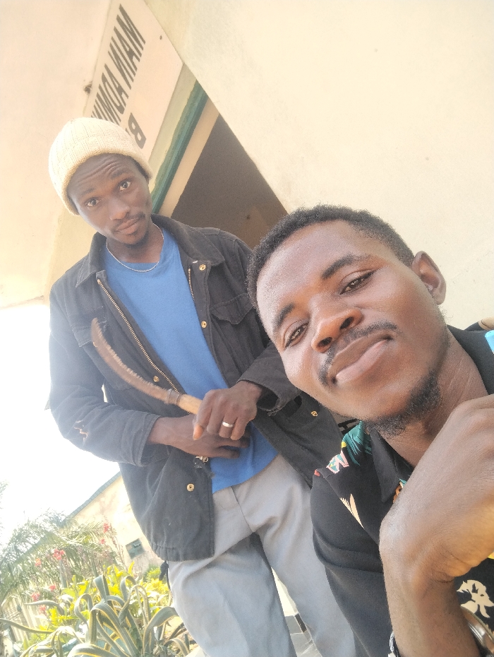 A selfie-style photograph depicts two young Black males outdoors in the city of Unknown, Unknown. The male in the foreground, positioned on the right, has short dark hair and a light beard, looking directly at the camera with a slight smile while wearing a dark polo shirt with a multicolored pattern. The second male stands in the background, slightly to the left, wearing a light-colored knitted beanie, a dark jacket partially unzipped over a bright blue t-shirt, and light-colored trousers. He holds a curved, machete-like tool with a light-colored handle in his left hand, on which a silver ring is visible on the fourth finger. He looks at the camera with a neutral expression. Behind him, a light-colored building wall features a partially visible sign with dark lettering, reading "MAIN ADM" (likely "MAIN ADMINISTRATION") and a capital letter "B" below it. Various green plants are visible in the lower-left background. The scene is illuminated by bright daylight.