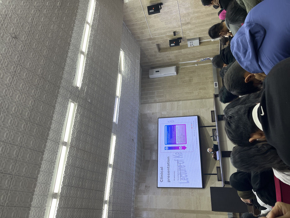 This image depicts an indoor lecture hall at the Kyrgyz State Medical Academy (KSMA) in Bishkek City, Kyrgyzstan, viewed from the rear of the room