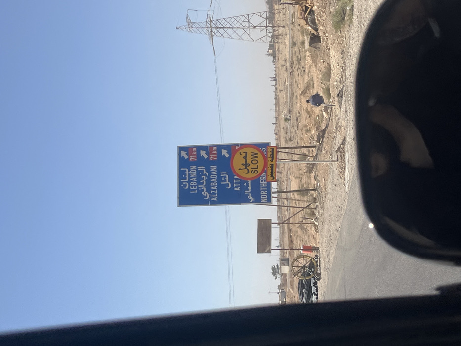 An outdoor daylight scene, likely viewed from a vehicle due to a partial dark frame on the left and a rearview mirror in the foreground, depicts a semi-arid environment in the City of Adra labor, Syria. The sky is clear and bright blue. In the mid-ground, a prominent blue road sign with white text indicates directions and distances: "LEBANON 71Km" (right arrow), "ALZABADANI 71Km" (right arrow), and "ATTAL" (right arrow), along with corresponding Arabic script. Below it, a yellow circular sign reads "SLOW" (Arabic: تمهل), with additional Arabic text "شمالي" (Northern) and "نقطة تفتيش" (checkpoint). To the left of this sign, a smaller, blank rectangular wooden sign is mounted on posts. Further left, a large wooden spoked wheel rests near coiled black pipes or cables, and a red object, possibly a fire extinguisher, is also present. The ground consists of reddish-brown earth with sparse vegetation and scattered rocks. A paved road surface is visible in the lower left. In the right mid-ground, a lone individual, dressed in dark clothing, walks away from the camera across the open, unpaved terrain. In the far right background, a large metal electricity pylon stands against the horizon. Debris and construction materials are scattered on the right side of the scene.
