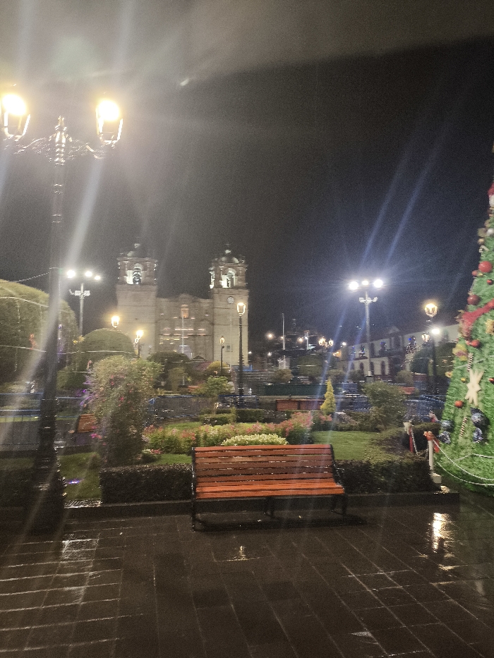 At night, a park scene unfolds with a church illuminated in the background. A wooden bench sits on a brick path, wet from rain, reflecting light. A decorated Christmas tree stands to the right. Street lamps cast a bright glow. Flowers and manicured greenery adorn the park, adding color to the nighttime ambiance. The sky is dark, with an atmospheric quality.
