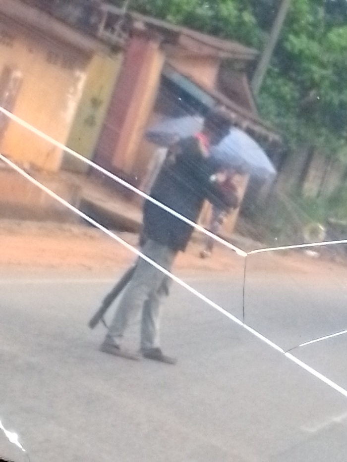 The image captures a blurry, low-resolution street scene in Nnobi, Nigeria, viewed through a fractured transparent medium, evidenced by multiple prominent white diagonal lines and cracks across the frame. A single individual, appearing male, is centered on an asphalt road. They are dressed in a dark jacket or shirt, light-colored trousers (possibly grey), and dark shoes. A distinctive red garment or accessory is visible around their upper chest/neck area. The individual holds an open, light-colored umbrella (possibly light blue or white) directly over their head, suggesting protection from precipitation or sun. A long, dark object, consistent in shape and proportion with a rifle or shotgun, is slung over their left shoulder and hangs down their back. The individual's posture suggests movement along the road. In the background, to the left and center, several single-story buildings with light brown/orange painted facades are visible, some featuring colored doors or window frames (yellow, reddish-brown). Further in the background, to the right, green foliage from trees or bushes is discernible. The immediate foreground is dominated by the fractured viewing pane, obscuring parts of the road surface.