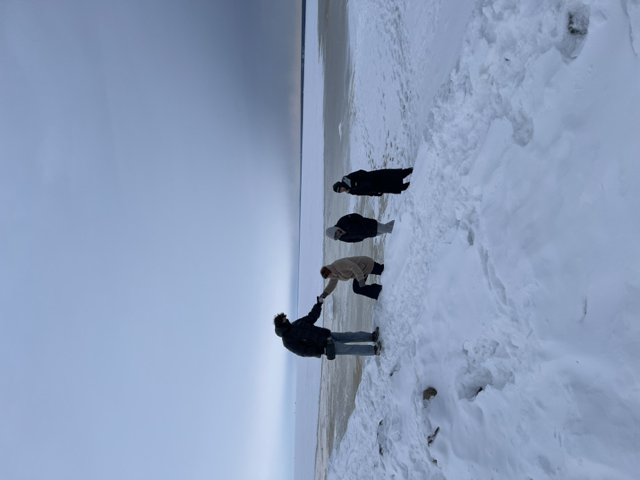 Four people stand on a snow-covered bank. The person closest to the camera, in a dark jacket and jeans, reaches out to help someone in a tan coat and black boots. Behind them are two more figures dressed in dark winter coats, standing further away. The backdrop features a vast expanse of what appears to be a frozen body of water or a snow-covered landscape under a pale sky. The image is oriented vertically.