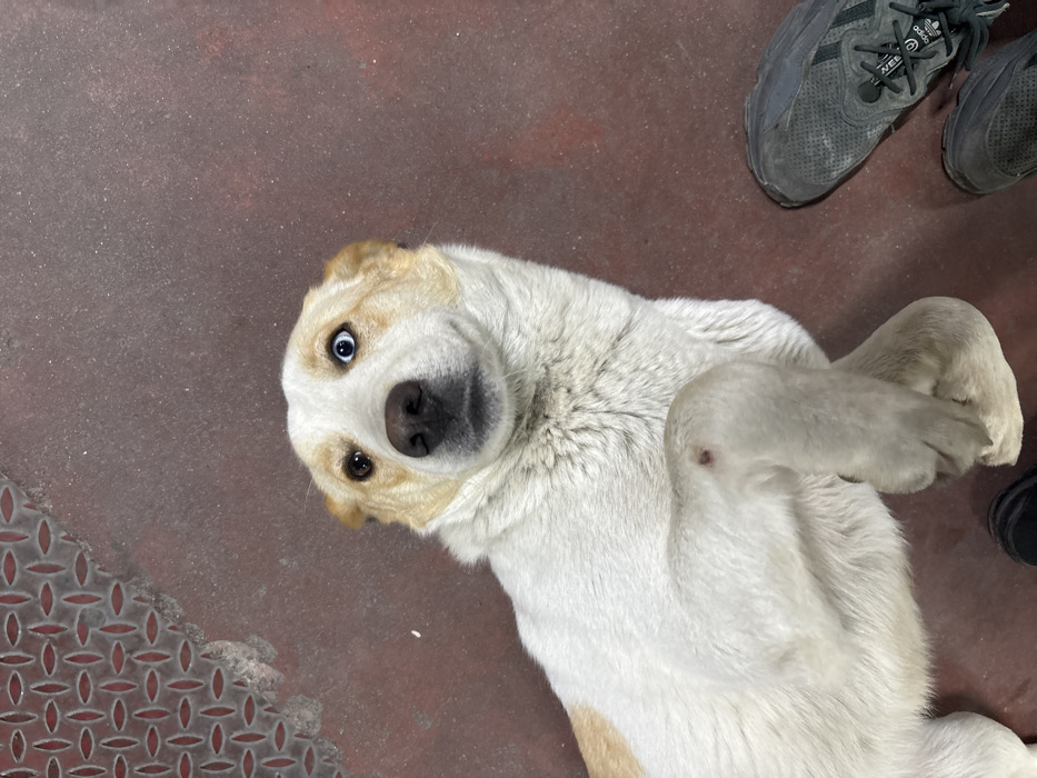 An overhead photograph, taken in Svilengrad, Bulgaria, captures a medium-sized dog lying on its back on a reddish-brown floor. The dog, primarily white with tan fur on its ears and along its sides, gazes directly upwards towards the camera. Its eyes display heterochromia; the left eye (from the dog's perspective) is dark brown, and the right eye is light blue. Its black nose is centered, and its mouth is slightly open. The dog's left front paw is bent, revealing a small, reddish, circular lesion or scab on the elbow area. In the upper left quadrant of the frame, a section of dark, diamond-patterned metal grating is visible, adjacent to the reddish-brown floor. In the lower right quadrant, two dark-colored athletic shoes are partially visible, indicating a person is standing near the dog.