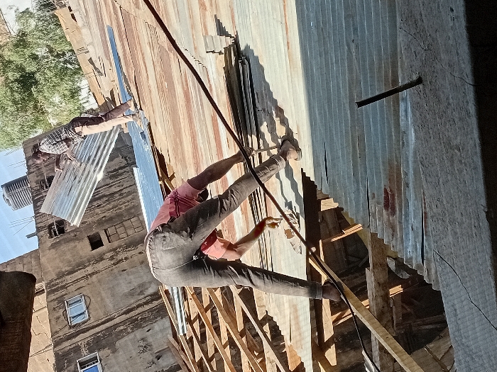 - "The image depicts two individuals engaged in roofing work under clear daylight in Gandu Albasa, Nigeria" by FM-vLomI3, licensed under CC BY 4.0