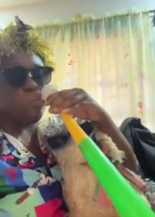 A person wearing a colorful patterned shirt and dark sunglasses is holding a yellow and green noisemaker to their mouth and blowing into it. The person has glitter tinsel in their hair. A stuffed animal dog with sunglasses and a patterned tie is being held in the person's other arm. The background is a light-colored wall and window covered by a yellow sheer curtain.