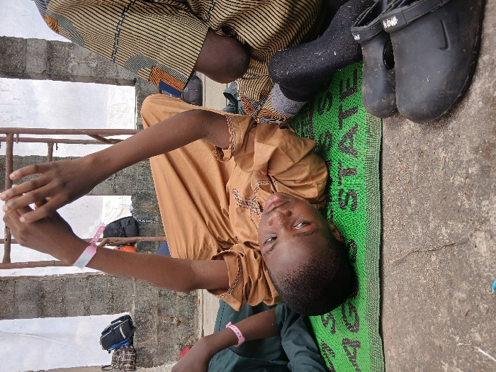The image depicts an outdoor scene in Epe, Nigeria, featuring three individuals on a concrete surface. The central figure is a young person, with dark skin and short hair, lying supine with their head rotated left towards the camera. They wear a light brown, long-sleeved garment with embroidered cuffs. Both arms are elevated with hands clasped above their head. A pink and white wristband is visible on the left wrist. This individual rests on a green mat displaying partially visible black text, including "STATE." To the left, a partial view of another individual shows an arm and shoulder in a dark green long-sleeved garment, with a pink wristband on the wrist. To the right, a third individual's lower torso and leg are visible, clad in a patterned garment featuring yellow, orange, blue, and black designs, and dark socks. A pair of black, closed-toe sandals with a white logo rests on the concrete ground near this person's feet. The background reveals a rugged outdoor environment with concrete block structures, a reddish-brown metal frame or scaffolding, and draped white fabric. Two bags, one black with blue accents and one brown/beige patterned, are visible near the background structures. The ground is a grey concrete surface exhibiting cracks. The sky above appears overcast.