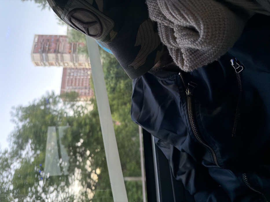 The image depicts an interior view from a moving vehicle, likely public transport, looking out a large window during daytime under a clear, light blue sky. In the immediate foreground, positioned on the right, is a camouflage-patterned baseball cap featuring a prominent multi-pointed star emblem, possibly a Mercedes-Benz logo. Adjacent to the cap is a bunched-up, light beige knitted garment. A dark blue or black jacket with multiple metallic zippers lies folded across the lower left portion of the frame. A frosted or opaque horizontal strip, part of the vehicle's window structure, traverses the middle of the pane. Outside the window, a dense canopy of green trees fills the midground, suggesting a park or heavily treed area. In the background, urban residential architecture is visible. A tall, multi-story building stands prominently on the right, characterized by a weathered, mottled facade exhibiting shades of brown, grey, and faded red, with numerous visible balconies and vertical structural elements. Behind this, and slightly to the left, another large, reddish-brown residential building is discernible. Based on the distinct architectural style of the high-rise buildings and the combination of dense urban development with extensive green spaces, the scene is located in the city of Buenos Aires, Argentina. The view strongly suggests the **Palermo** neighborhood, specifically an area bordering its large parks (e.g., Bosques de Palermo), observed from an elevated perspective such as a bus or train traveling on an overpass or viaduct.