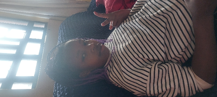 A young girl with purple braids is lying down, partially illuminated by sunlight filtering through a window. She wears a striped shirt and holds her hand up in a peace sign. The background features a dark woven surface, possibly a blanket or chair. The image is slightly blurred and the camera angle is off-center.