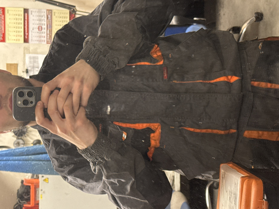 A male individual is depicted in a mirror selfie, featuring his torso, arms, and lower facial region, including a chin and jawline with stubble. He holds a dark-colored smartphone horizontally with both hands, obscuring his upper face. He is dressed in a dark grey or black work overall, accented with prominent orange panels and vertical stripes, and splattered with white specks, consistent with paint or dust. The garment includes elasticized sleeve cuffs and a small red brand tag on the right chest area. The background, visible as a reflection, suggests an industrial or workshop setting. To the left, an orange plastic container sits on a shelf, with a light blue textile hanging nearby. To the right, a red-topped wall calendar displaying Cyrillic script and a grid of dates is affixed to a light-colored wall, with additional papers below it. A lamp with a silver pole is visible further right, and a partial view of a wheeled office chair base appears at the bottom right. This scene is situated in a facility in the city of Perm, Russia.