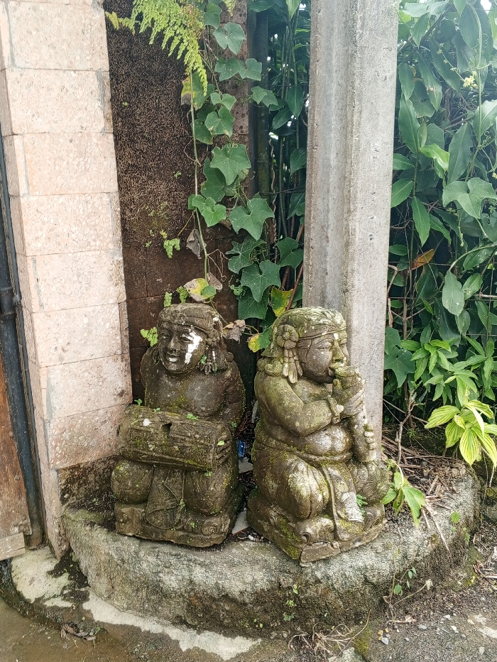 Two moss-covered stone statues sit on a weathered stone base. The statue on the left has white markings on its face and holds a cylindrical object, while the statue on the right appears to be putting something to its mouth. Lush green plants and vines grow behind the statues, blending with the stone elements. A light-colored brick wall stands on the left side. A concrete pillar is seen behind the statue on the right. The stone base has small patches of dirt and scattered thin, dry leaves.