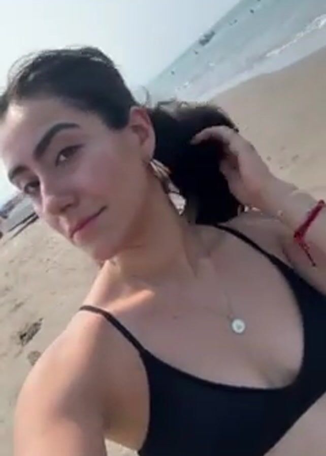A young woman in a black bikini takes a selfie on a beach. She has dark hair pulled back, hoop earrings, and a necklace. The beach has tan sand and other people walking in the background. A small boat sits on the sand behind her. The ocean is visible with waves coming to shore. The sky is overcast.