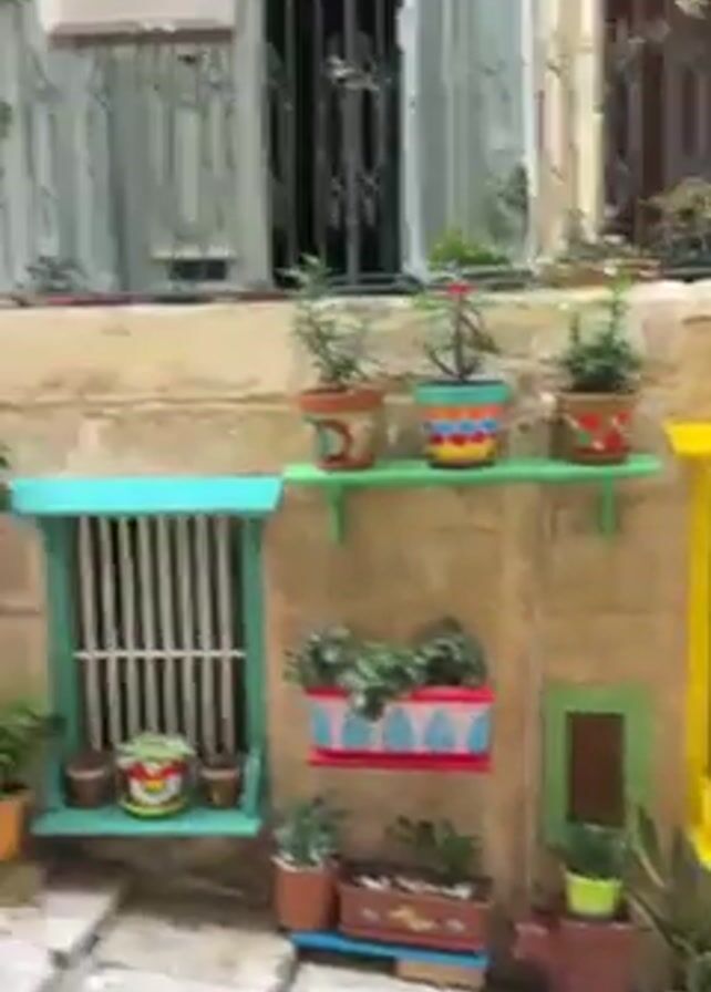street scene in a European town. The camera pans from a close-up of a building façade decorated with numerous potted plants and flowers to show a stepped street leading uphill. The buildings lining the street are constructed from light-colored stone and feature balconies and windows. Two people walk up the stairs toward a distant archway and a parked car.