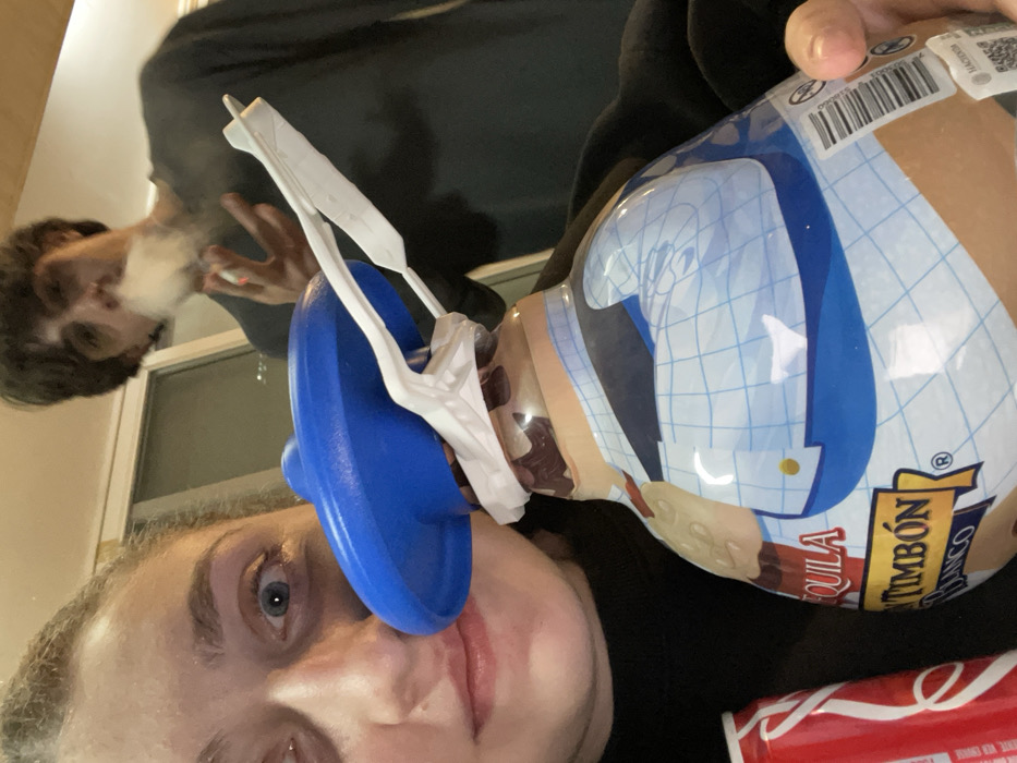 An indoor, close-up image depicts two individuals and various beverages under artificial lighting. In the foreground, partially visible on the left, is a female with light skin, dark hair pulled back, and wide blue eyes. She holds a large, clear glass bottle shaped like a cartoon figure. The bottle features a blue sombrero-shaped cap and a white plastic straw system. Its label clearly displays "TEQUILA TIMBÓN BLANCO." A red Coca-Cola can is also partially visible in her left hand. In the blurred background, to the right, a male with dark, curly hair and a dark long-sleeved shirt is exhaling a plume of white smoke, indicating he is smoking a cigarette held in his right hand. The environment appears to be an interior space, possibly a room with a light source or window in the distant background. The specific location within the city of Acatlipa, Mexico, cannot be determined from the visual evidence presented in the image.