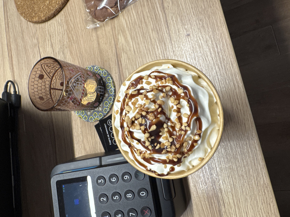 The image displays an overhead view of a light-colored wooden table within a Coffee Spot establishment located in Varna, Bulgaria. A prominent beige disposable cup contains a beverage topped with a substantial swirl of white whipped cream, artfully drizzled with dark caramel sauce, and generously sprinkled with crushed nuts. To the immediate left of the cup, a black electronic payment terminal is present, its screen displaying a blue contactless payment symbol and a portion of a numerical keypad. Partially visible behind the terminal and adjacent to the cup are two black cards, one explicitly labeled "карта за лоялност" (loyalty card in Bulgarian). To the upper right, a brown decorative glass candle holder, adorned with gingerbread house patterns and containing a softly illuminated element, rests on a circular coaster featuring a blue and yellow geometric design. Further to the right, a clear plastic bag encloses a single brown baked item, likely a cookie. A segment of a cork coaster is also visible in the upper right. No individuals are depicted in the scene.