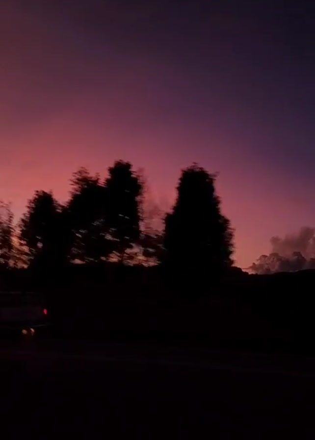 The video depicts a vibrant sunset with shades of purple and pink dominating the sky. Silhouetted trees and a mountainous horizon are visible against this colorful backdrop. A road is at the bottom of the frame. A car travels along the road. The overall scene is dark, with the sunset providing the primary light source.
