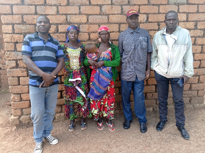 Five individuals, comprising three adult males and two adult females, are positioned in a linear arrangement, standing against a reddish-brown brick wall in Abengwa, Democratic Republic of the Congo