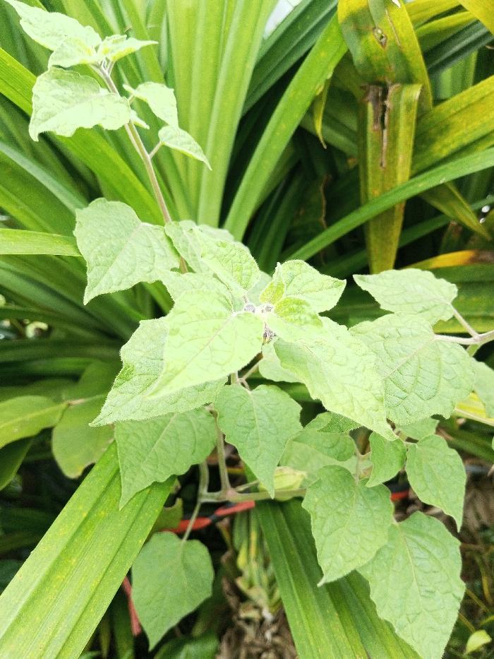 Green leaves with textured surfaces dominate the frame, belonging to a plant with slender stems