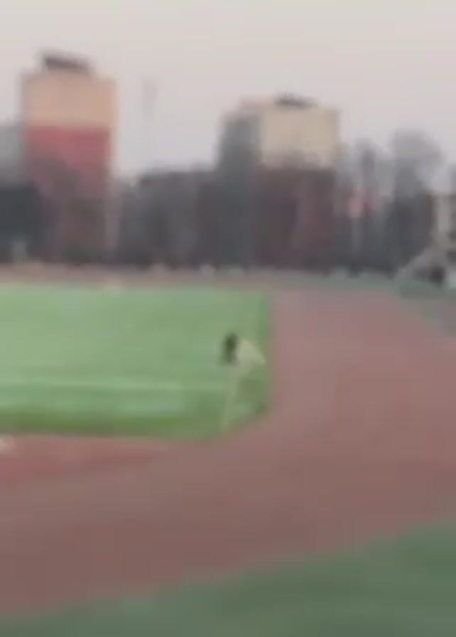 person walking on a red track surrounding a green soccer field. The field has white lines marking the playing areas. In the background are two tall buildings, trees without leaves, and a gray sky. A black fence runs along the bottom of the frame. The person is walking away from the camera.