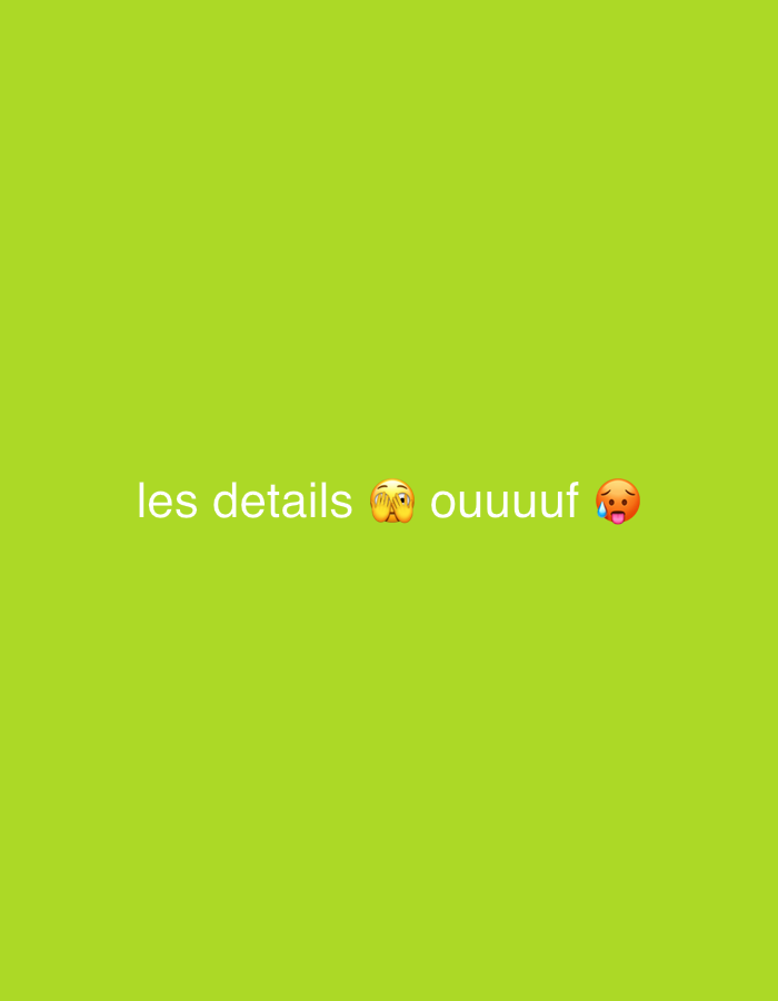 A bright green background features white text stating "les details 🫣 ouuuuf 🥵"