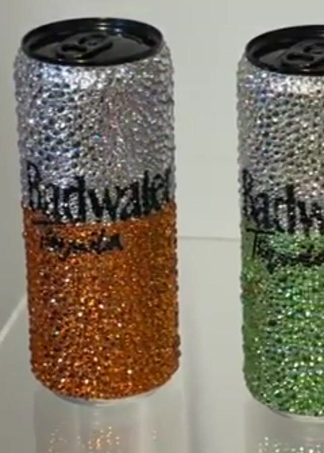 three cans of sparkling water covered in sparkly rhinestones. The brand is "Badwater Tequila". The top portion of each can is covered in silver rhinestones, and the bottom portions are covered in orange, green, and gold rhinestones. The cans are sitting on a white surface. Someone can be heard speaking quietly in the background.