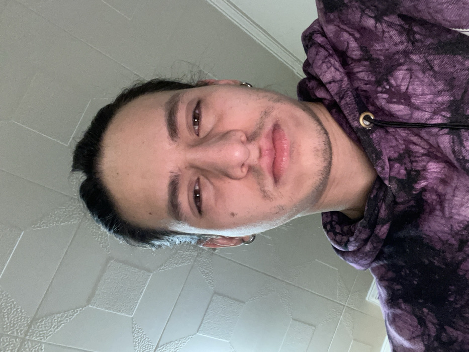 A man with brown eyes and dark hair pulled back looks down at the camera. He wears a purple and black tie-dye hoodie with gold eyelets. His face is slightly puckered with a small mole on his left cheek. He has small hoop earrings. The background is a textured off-white wall or ceiling. The perspective is a low-angle shot.
