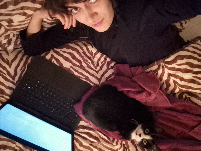 The image depicts an indoor scene in Châtelaillon-Plage, France. A female individual with dark, wavy hair and a dark long-sleeved top is positioned centrally in the upper frame, lying on her back, propped up, and looking directly at the camera. Her left arm is bent, with her hand near her head. Adjacent to her, in the lower right portion of the frame, a black and white cat with distinct white facial markings and green eyes is resting on a folded maroon or purple blanket. To the left of the cat, a black laptop or tablet with an attached keyboard cover is open, displaying an illuminated, light blue screen with indistinct graphical elements. All subjects are situated on a surface covered by a brown and off-white zebra-print patterned fabric. The lighting is ambient, indicating an interior setting.