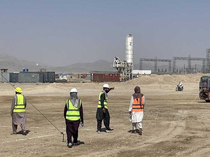 An elevated view captures an expansive, arid construction site under a clear, pale blue sky in Pir Dust, Afghanistan. In the foreground, four individuals, presumably male construction workers, are observed from behind or the side, wearing traditional attire augmented with high-visibility safety vests and hard hats. From left to right: one individual in a yellow hard hat and vest walks away from the viewer; a second wears a white hard hat, a grey head covering, a yellow vest, and holds a blue water bottle, walking forward with a dark measuring rope or line extending from a ground anchor near their feet; a third, in a white hard hat and yellow vest, faces right, actively pointing forward with his right arm; and a fourth, in a head covering and an orange vest, walks away from the viewer. The midground consists of disturbed, light brown earth with scattered piles of sand or gravel. Numerous shipping containers, colored blue, brown, and white, are visible, likely serving as temporary site offices or storage. A prominent white concrete batching plant, marked with a "Z" logo on its silo, stands centrally. Further back, skeletal steel structures, resembling electrical transmission towers or a substation, are under construction. A person on a motorcycle traverses the dusty terrain from left to right in the mid-distance. The rear of a colorful, possibly decorated, truck is visible on the far right, with a yellow hose or cable extending from it onto the ground. The background features hazy, distant mountains blending into the horizon under the bright sky.