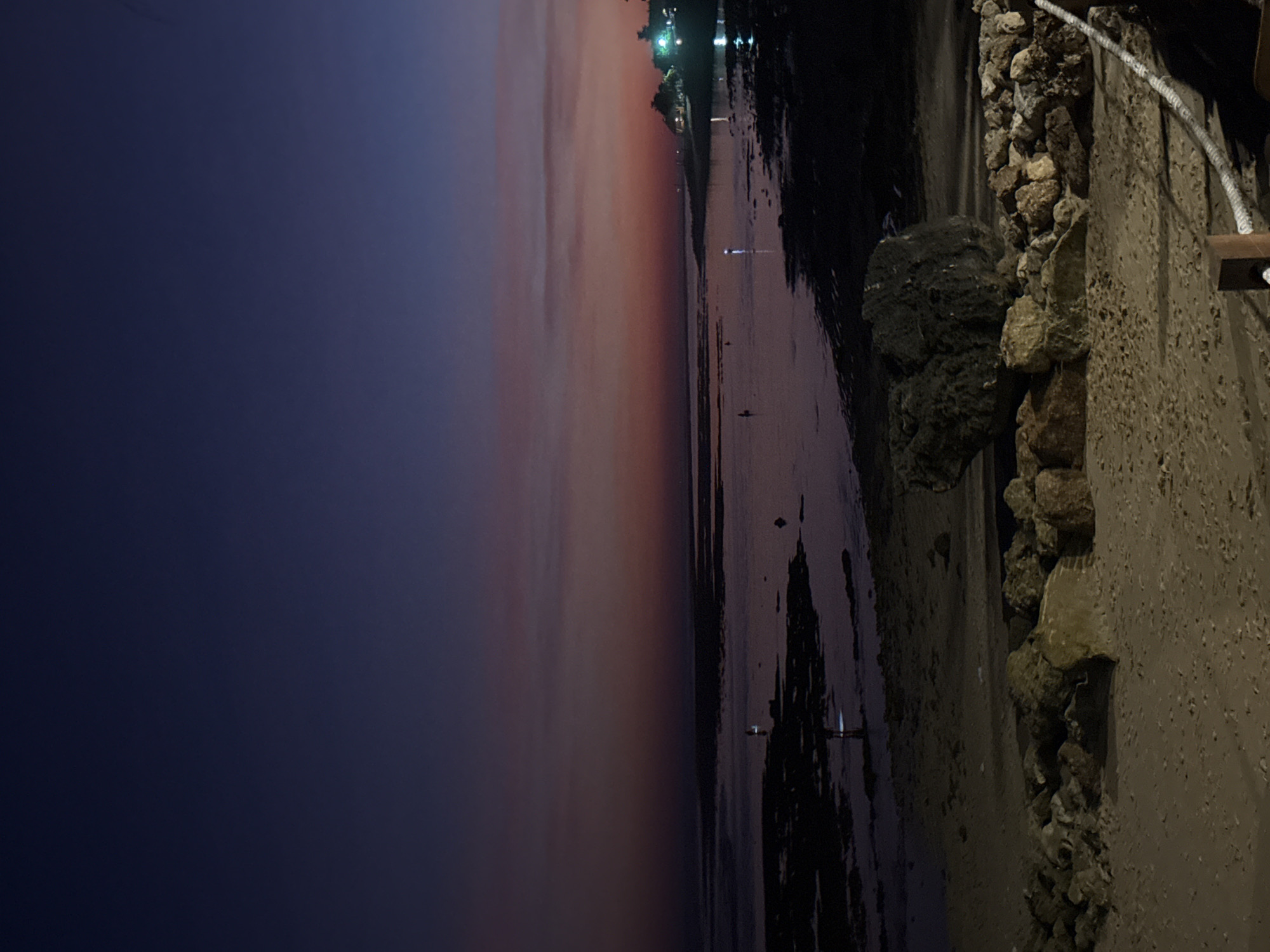 At dusk in Kuta Selatan, Indonesia, the image captures a scene at the edge of the sea. The sky is a gradient of dark blue transitioning into a reddish hue near the horizon. The sea reflects the colors of the sky, exhibiting a purplish-brownish color. On the right side of the image, the edge of a stone wall or walkway is visible, with a rope attached. There are vague shapes in the water that could potentially be boats or people. The shoreline is dark, contrasting with the lighter colors of the water and sky. The general ambiance is dim and serene.